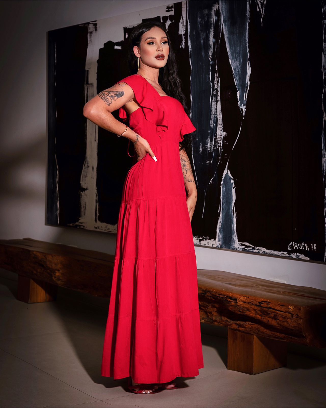 VESTIDO LONGO BABADO AMARRAÇÃO NAS COSTAS